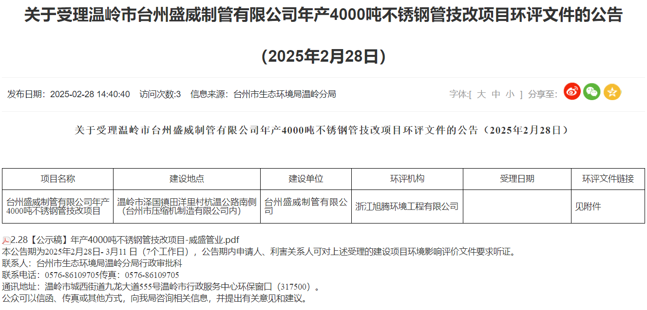 溫嶺臺州盛威制管有限公司年產(chǎn)4000噸不銹鋼管技改項(xiàng)目環(huán)評獲受理