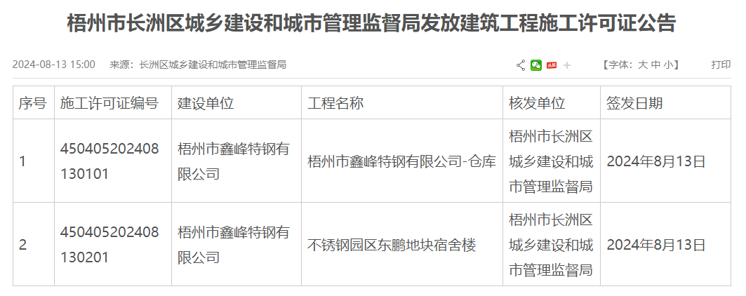 8月13日,梧州市鑫峰特鋼有限公司不銹鋼倉庫及不銹鋼園區(qū)東鵬地塊宿舍樓建設(shè)獲建筑工程施工許可證。